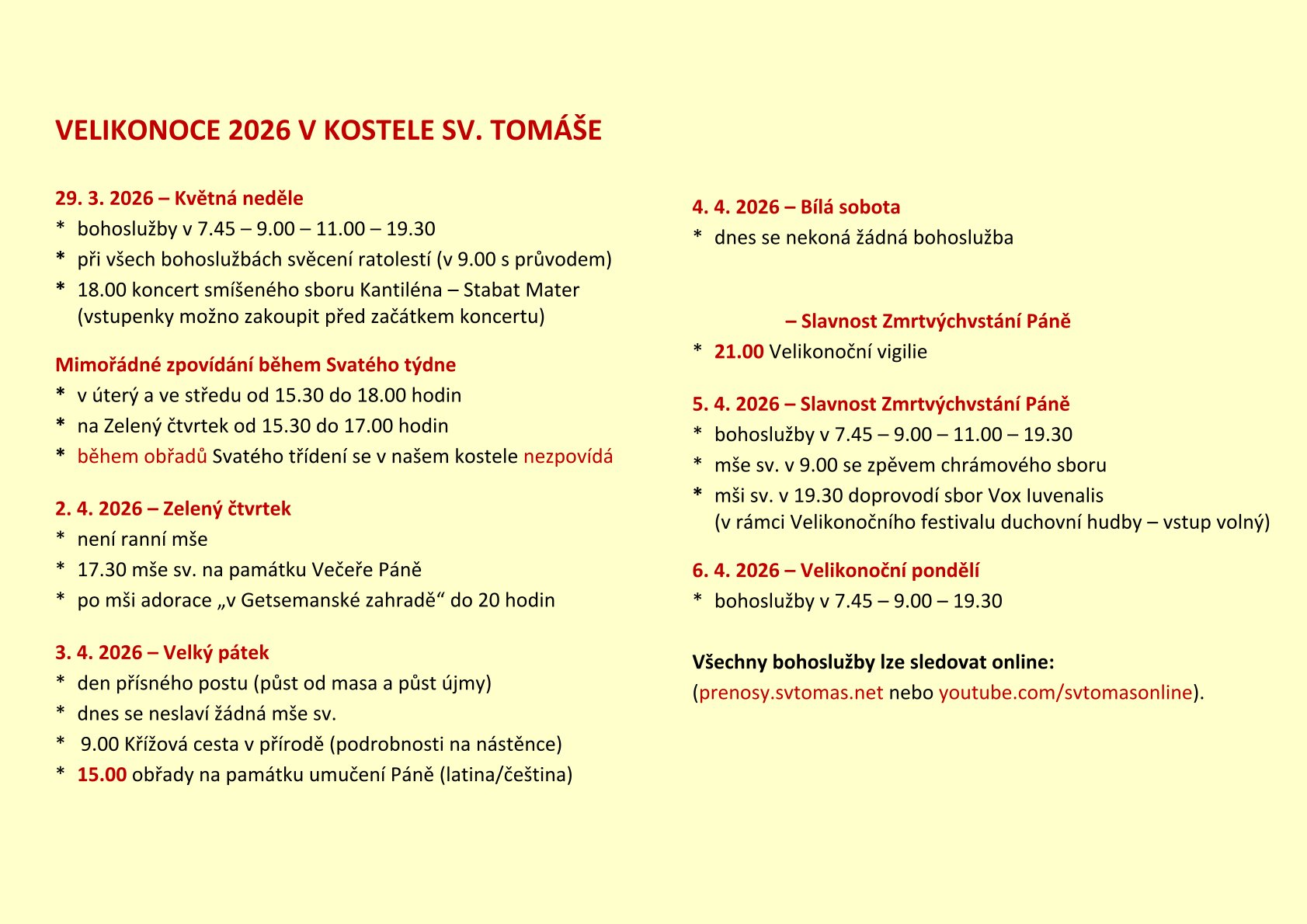 V neděli oslavíme Slavnost Zmrtvýchvstání Páně. Při ranní mši sv. zpívá Gregoriánská schola, při mši v 9 hodin bude zpívat chrámový sbor. Večerní mši v 19.30 doprovodí sbor Vox Iuvenalis; jedná se o doprovodnou akci velikonočního festivalu duchovní hudby.